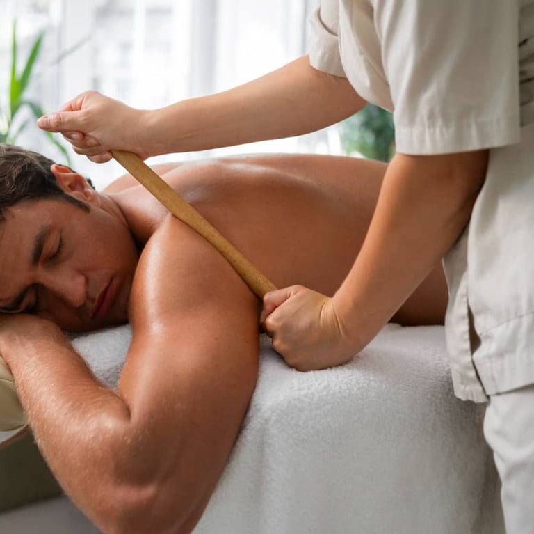 Masaje con maderoterapia: mediante movimientos rítmicos y precisos, se estimula la circulación, activa el metabolismo y favorece la eliminación de toxinas.